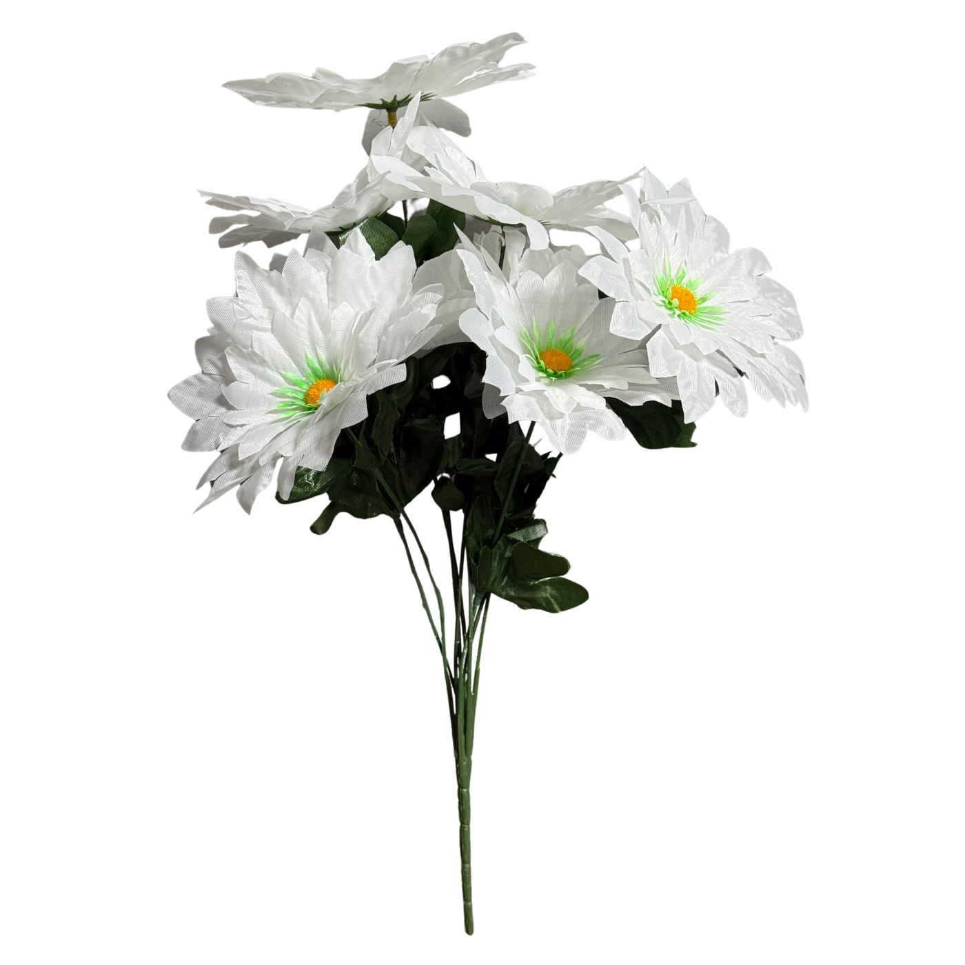 O buquê tem 9 flores de dálias artificiais em tom branco puro com miolo verde vibrante. As hastes e folhas em verde escuro são flexíveis para melhor posicionamento. Ideal para quem deseja beleza natural aliada à facilidade de uso.
