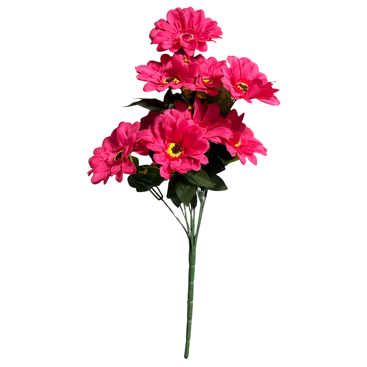 O buquê conta com 9 flores artificiais de gerbera em tom rosa, confeccionadas em material resistente que imita a textura e a aparência natural da flor. Cada flor possui caule verde flexível, facilitando o ajuste e posicionamento do arranjo.