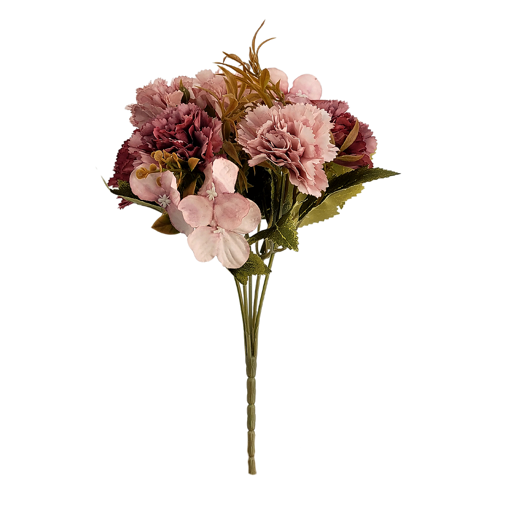 O buquê é formado por mini cravos com acabamento detalhado e folhas verdes que dão mais realismo. Sua altura de 28 cm permite uso em pequenos vasos ou decoração de espaços reduzidos. A peça é feita em materiais sustentáveis, que não exigem cuidados como rega ou sol. Perfeito para quem quer um toque de cor sem manutenção.