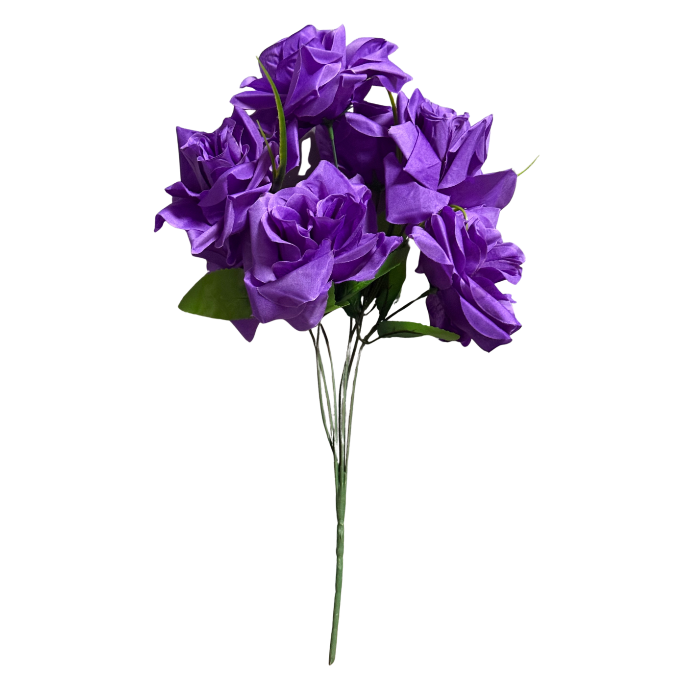 Buquê com 7 rosas artificiais na cor roxa, ideal para decoração que não perde o charme e a beleza com o tempo.