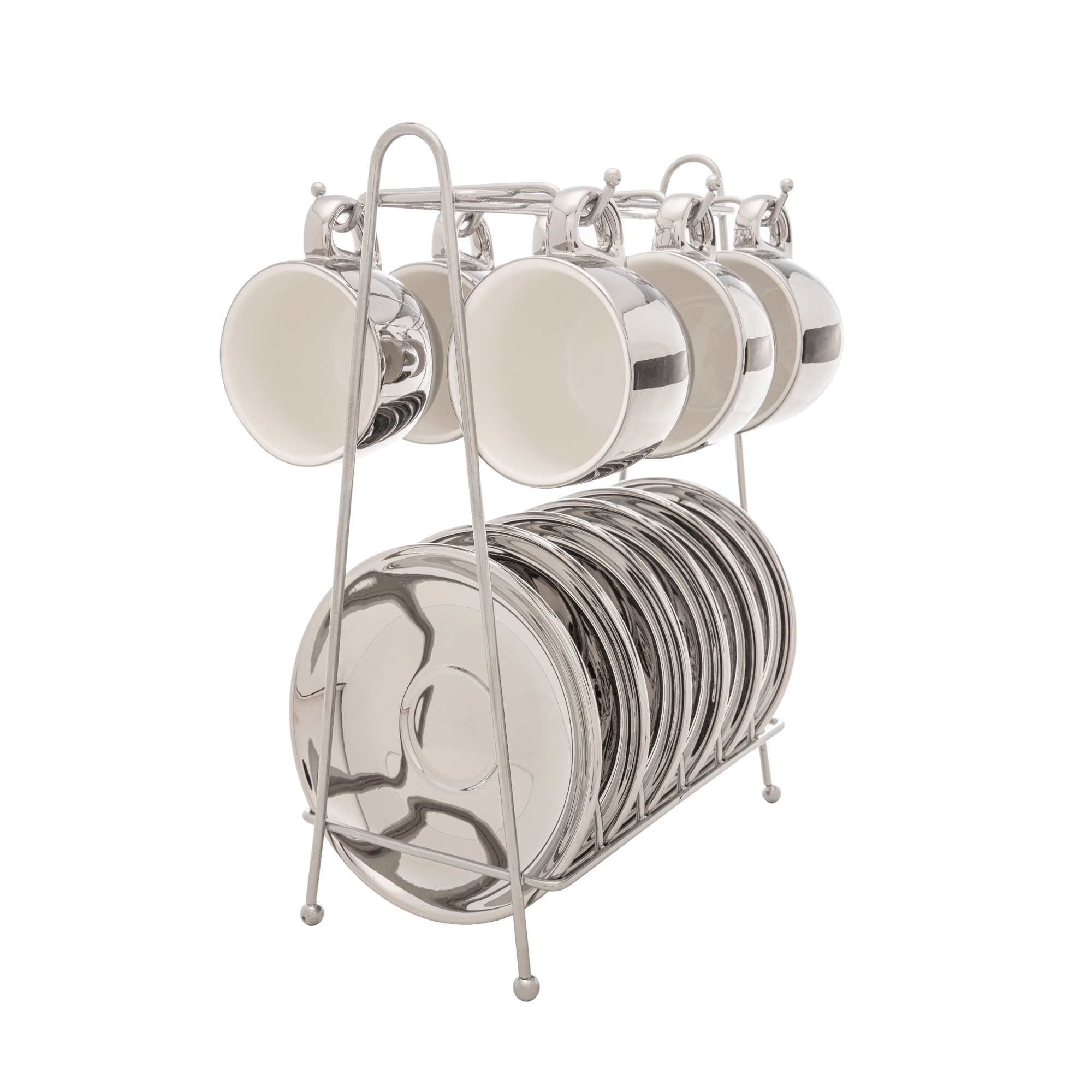 O suporte prata oferece uma maneira conveniente de armazenar e exibir as xícaras e pires, mantendo sua mesa organizada e elegante.