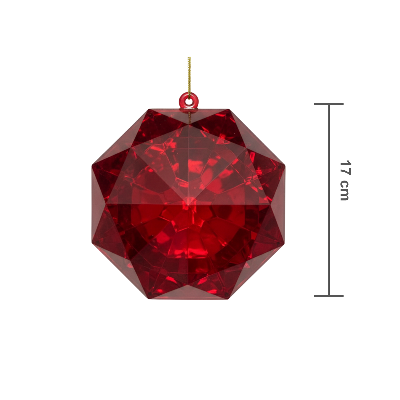 Com dimensões generosas de 16 cm de largura por 17 cm de altura, este enfeite tem um impacto visual poderoso e é ideal para árvores de grande porte, destacando-se como uma joia preciosa. Fabricada em Acrílico premium de alta resistência, a joia Vermelha possui a intensidade do vidro lapidado, mas com a grande vantagem de ser totalmente inquebrável, ultraleve e segura. Isso garante uma instalação fácil e uma durabilidade que fará desta peça um item indispensável e memorável em todas as suas futuras celebrações de Natal.