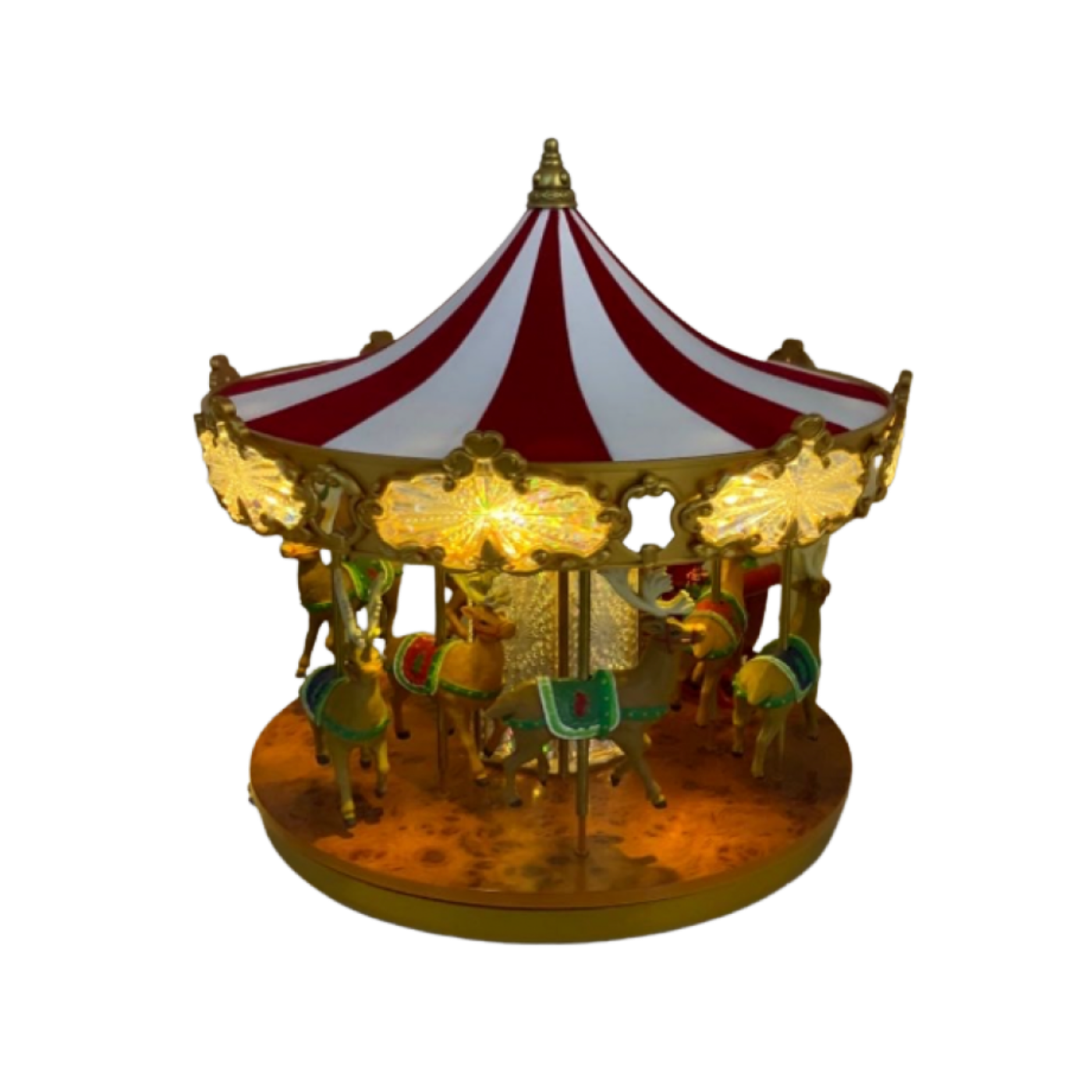 Apesar do seu tamanho reduzido (10 cm de largura), esta miniatura não economiza em detalhes e funcionalidade. Ao ser ligado, os cavalinhos giram suavemente (verificar se há movimento) ou são estáticos, iluminados por Luzes LED de tonalidade quente. Essas luzes estão embutidas sob o telhado, realçando a base e os detalhes dos cavalos, criando um brilho acolhedor e mágico. É ideal para nichos, prateleiras, ou como um presente temático.