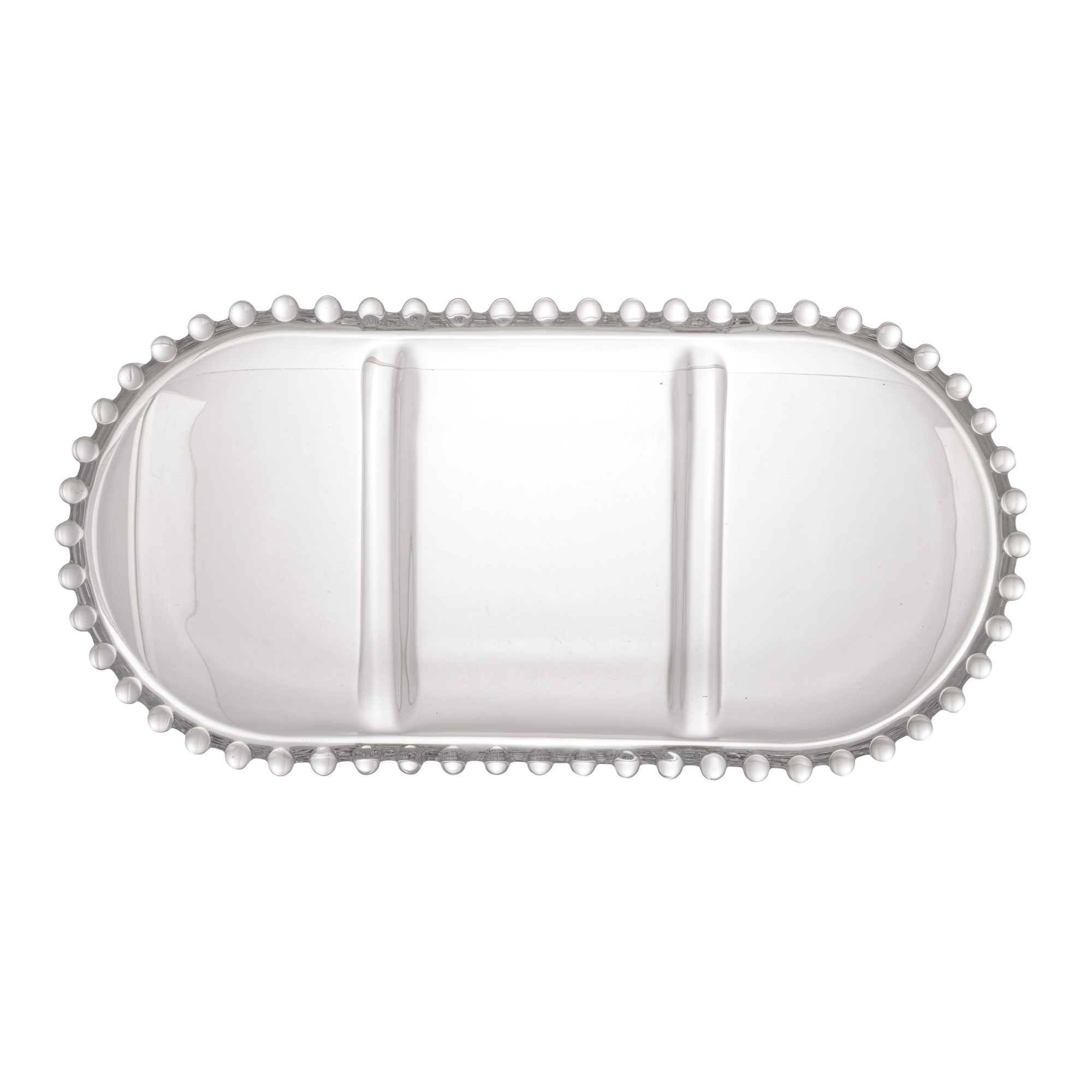Sirva seus convidados com sofisticação e estilo incomparáveis com a Petisqueira de Cristal Oval Pearl da Wolff. Com 30cm de comprimento, esta peça combina a elegância atemporal do cristal com a funcionalidade de três divisões ovais, permitindo que você organize uma variedade de petiscos, como queijos, frios, frutas secas e outros aperitivos, de forma atraente e organizada.