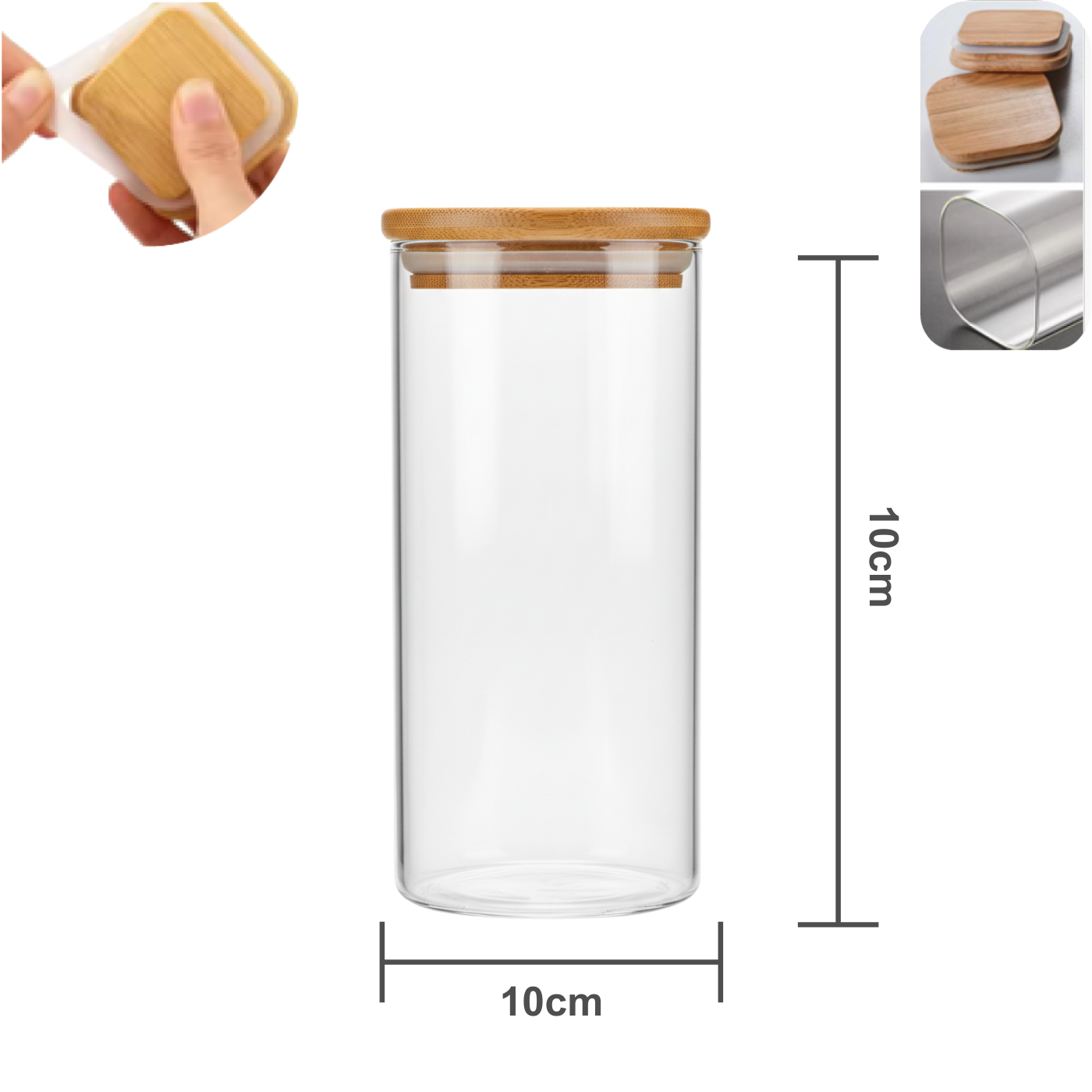 Pote de Vidro Boro Quadrado com Tampa de Bambu 10x10cm