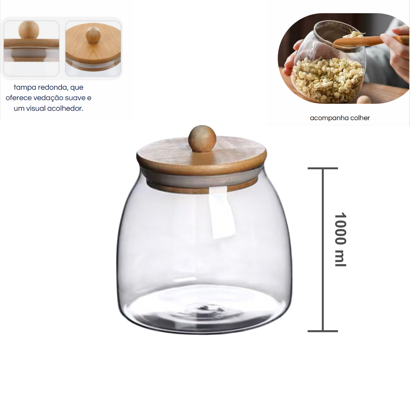 Pote Hermético Boro Redondo 1000ml com Colher Tampa Bambu Bojo