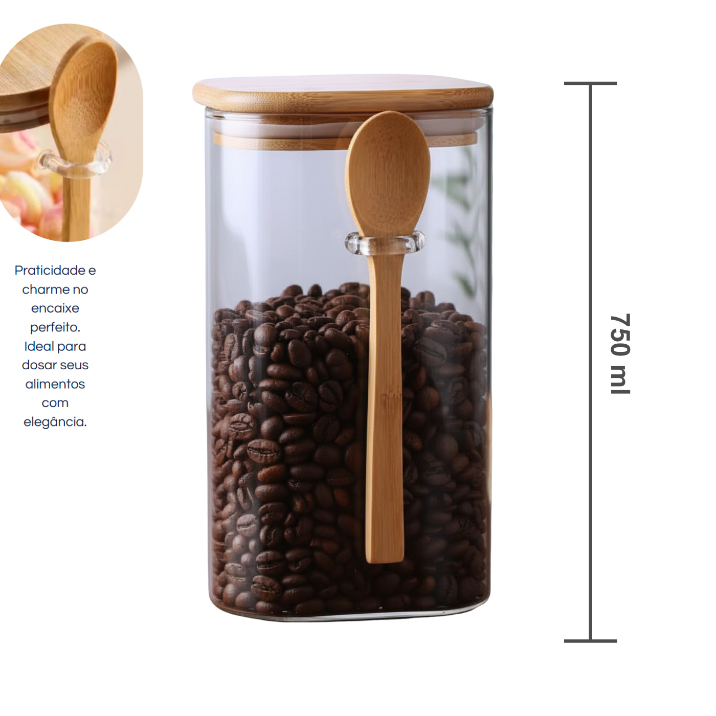 Pote Vidro Boro Quadrado Tampa e Colher de Bambu 10x10cm
