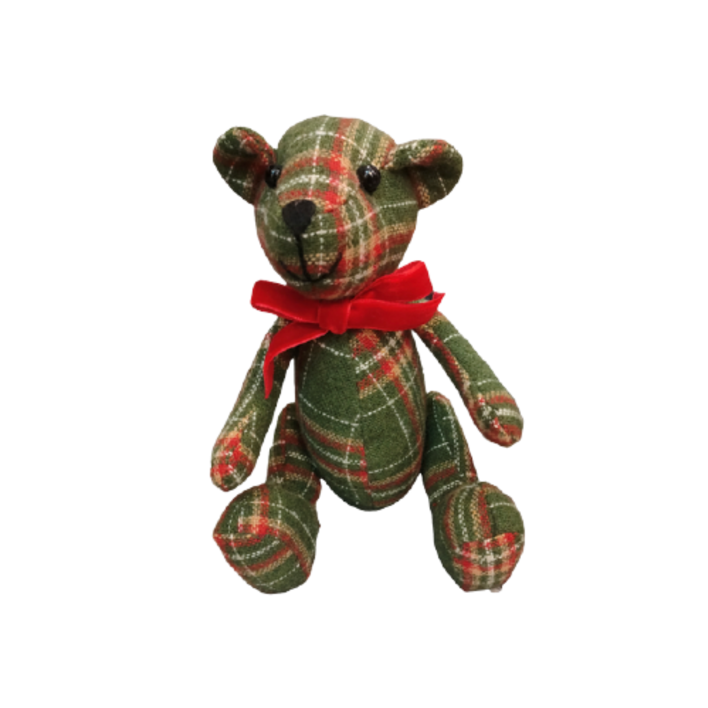 O ursinho é confeccionado com um tecido de padrão quadriculado (xadrez), um clássico do inverno e da decoração natalina que evoca immediately o estilo rústico e country. Finalizado com uma charmosa fita no pescoço, ele ganha um acabamento que equilibra a simplicidade do tecido com um toque de elegância festiva.